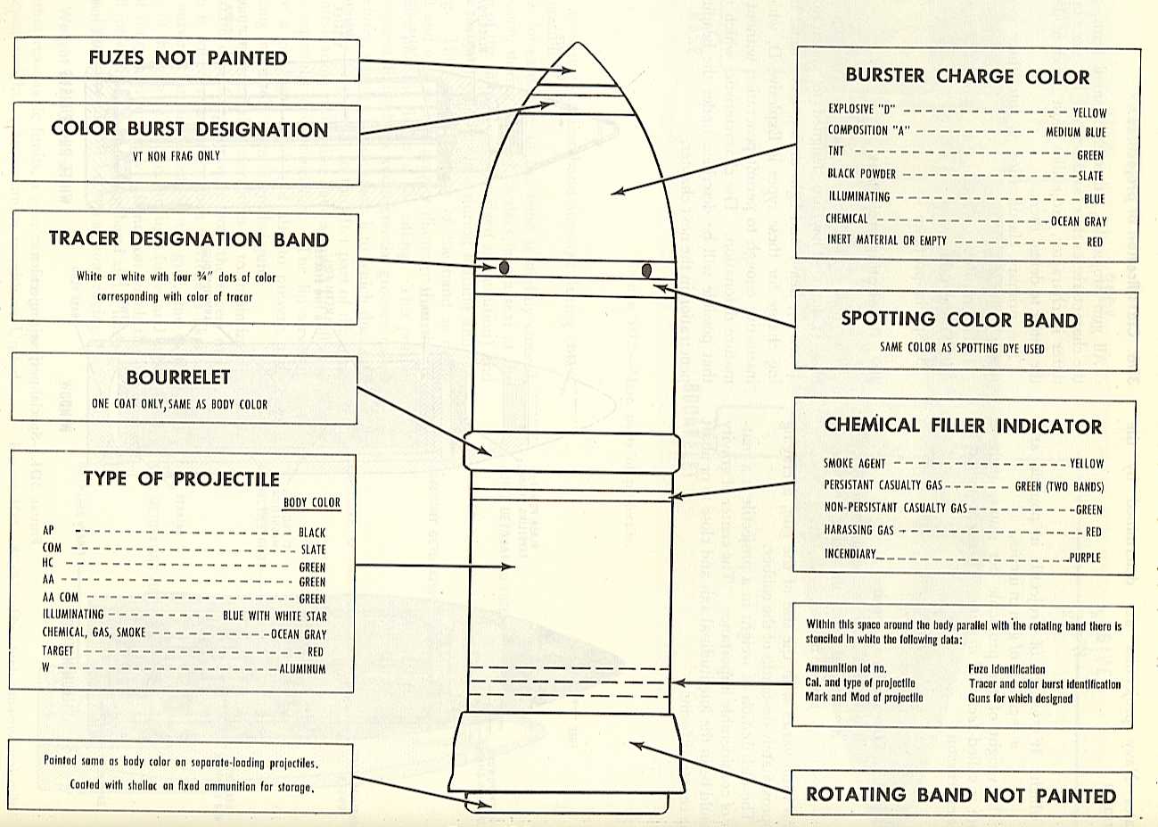Fixed and Semi-fixed (separate) cartridge cases had the index number painted in 0.75 inch (2 cm) high letters on the head end of the case. Semi-fixed (separate) cartridge cases also had their ammunition lot numbers painted on in the same size letters. In addition, cases with flashless propellant had the word FLASHLESS painted on the side of the case and a 0.75 inch (2 cm) F painted in yellow on the case head.