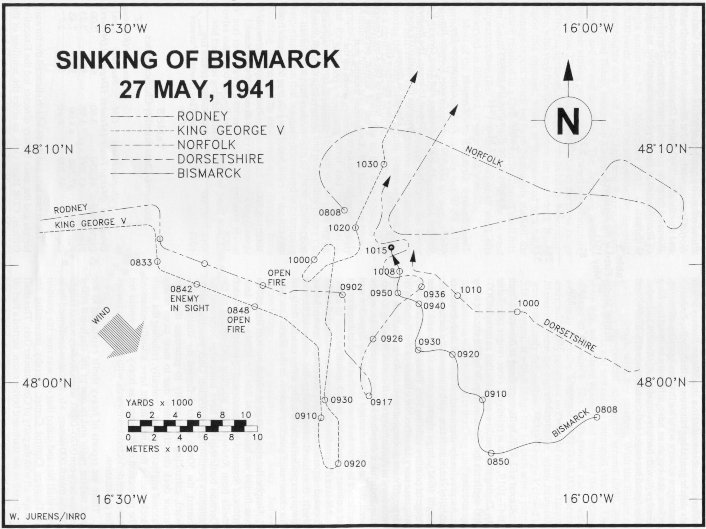 On the morning of 27 May 1941 Bismarck was surrounded by British forces consisting of battleships King George V (ten 14-inch guns) and Rodney (nine 16-inch guns), battlecruiser Renown (six 15-inch guns), aircraft carrier Ark Royal, heavy cruisers Norfolk and Dorsetshire (each with eight 8-inch guns), cruiser Sheffield and nine destroyers.