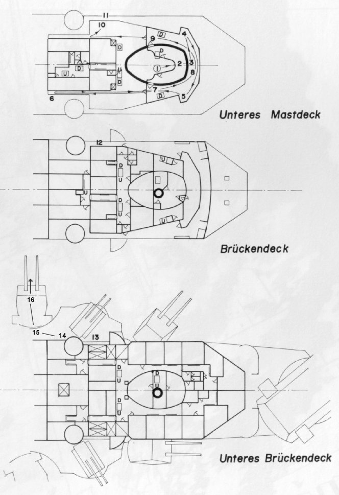 The above sketch is by Thomas G. Webb. Mr. Statz's Observations of Bismarck's Bridge A) Top of conning tower tube.Translation of Mr. Statz's sketch notations: I have recorded everything to the best of my recollection on the attached sketch. I did not notice any heavy damage to the rear portside of the conning tower. Naturally, the director had been destroyed. 1) Emerging from the cable shaft into the conning tower. |