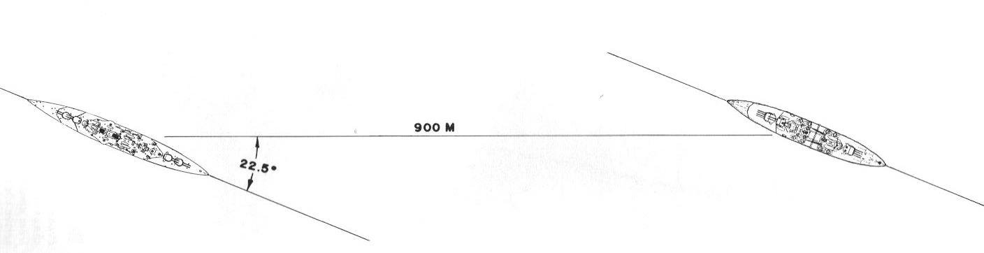 ". . . were compiled on the following day from the information available. Unfortunately, the plot where the narrative was being kept was thrown into some confusion by a large amount of blood that was pouring down from the compass platform onto the track chart."11 "A" arcs were said to be "open" when all main battery guns could bear on a single target forward of the beam, else "closed."