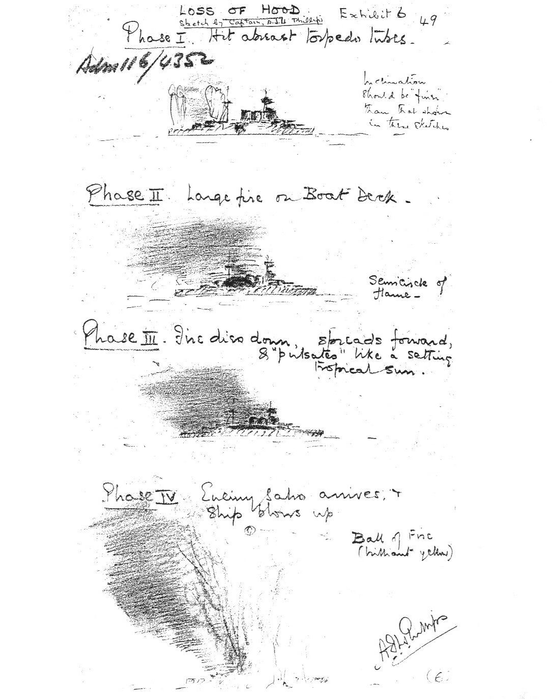 Aboard Hood, A.B. Robert E. Tilburn was lying down - the safest position for unoccupied personnel during action - on the boat deck on the port side just before Hood's port forward U.P. mounting and just abreast the forward funnel. He saw the projectile hit - just one, he was certain - on the extreme port side just at the forward edge of the aftermost U.P. mounting. "That hit us somewhere . . . ," he heard a shipmate say. The shell was, he testified ". . . a small one, because I don't think the deck was very thick and I think a big one would have gone through."24 "Could you say whether this shell penetrated the deck or not?" inquired the Investigative Board. He could not. He was, however, fairly certain that the resultant fire was of cordite. Although he didn't know whether the petrol for the boats ". . . two or three ten gallon drums and a big drum on a slipway," had been dumped, he thought the fire was too far forward to have been petrol in any case. An order was given to put the fire out, he recalled, but almost immediately countermanded because of the exploding ammunition. The explosions were fairly small, he said, ". . . like Chinese crackers," and didn't seem to cause the fire to spread very much, at least not in his direction. "Was the hatch for the 4-in ammunition hoist abreast the after funnel open or closed?" asked the court. "It was shut," he said, "I had asked the officer for orders and he had told me to leave it shut."