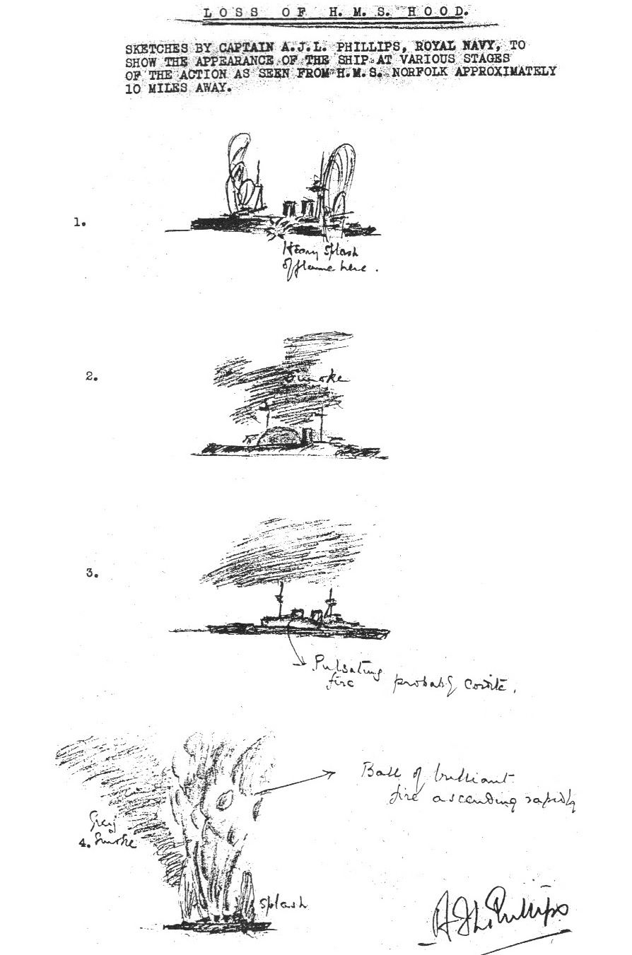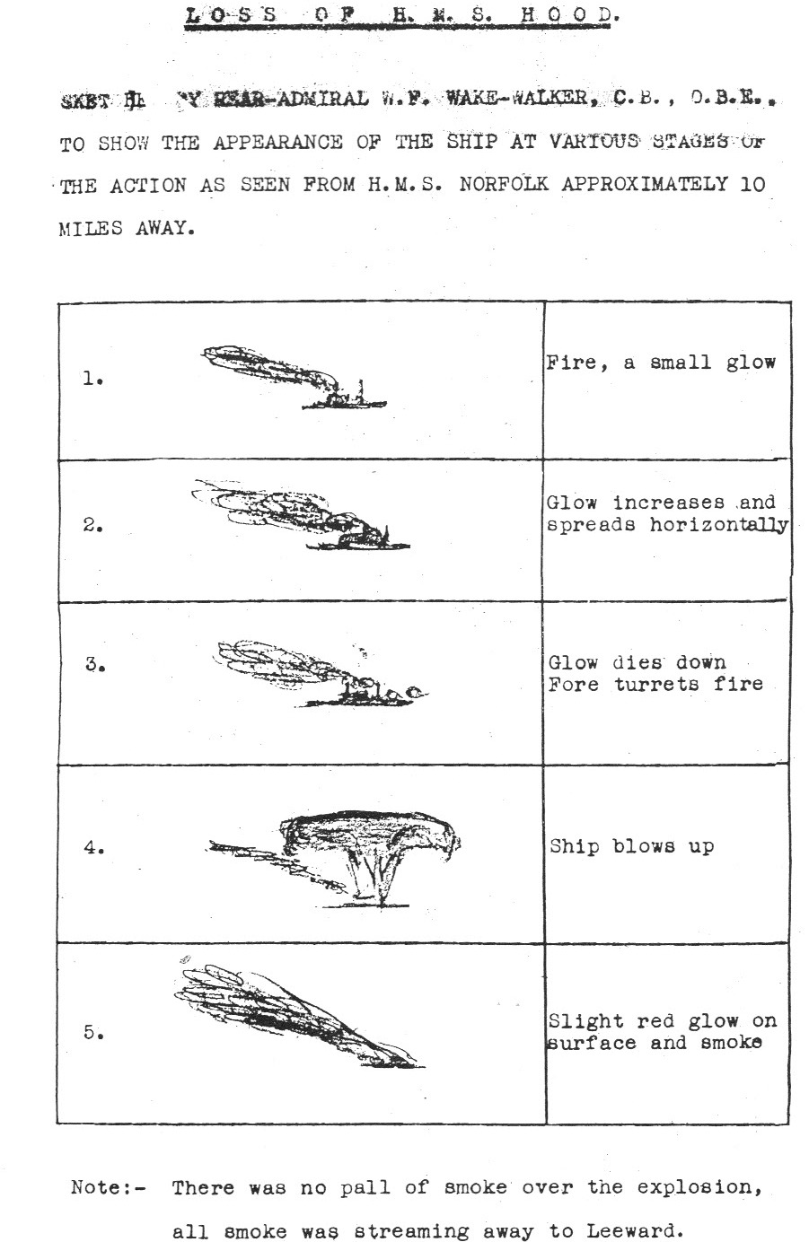 "During the approach 'Hood' made 'G.I.C.' - followed by - 'G.O.B.I.' - just before opening fire at 0552. Range approx 25,000 yards. 'Prince of Wales' opened fire at 0553. 'Bismarck' replied with extreme accuracy on 'Hood.' 2nd or 3rd salvo straddled and fire broke out in 'Hood' in the vicinity of the port after 4-in gun mounting. Lighter ship engaged 'Prince of Wales.' 'Prince of Wales' opening salvo was observed over, 6th was seen to straddle. At this time 'Prince of Wales' had five 14-in guns in action. 'Y' turret would not bear. Fire in 'Hood' spread rapidly to the mainmast. A turn of 2 blue [indicating a course change of 20º to port] at 0555 opened 'A' arcs at 'Prince of Wales' ninth salvo.11 'Hood' had a further 2 blue flying when, at 0600, just after 'Bismarck's fifth salvo, a huge explosion occurred12 between 'Hood's' after funnel and mainmast and she sank in three or four minutes. 'Hood' had fired five or six salvos, but fall of shot was not seen, possibly because this coincided with firing of 'Prince of Wales' guns."