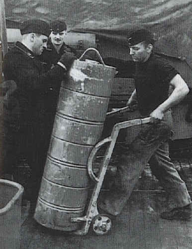Crewmen move 28 cm charge container