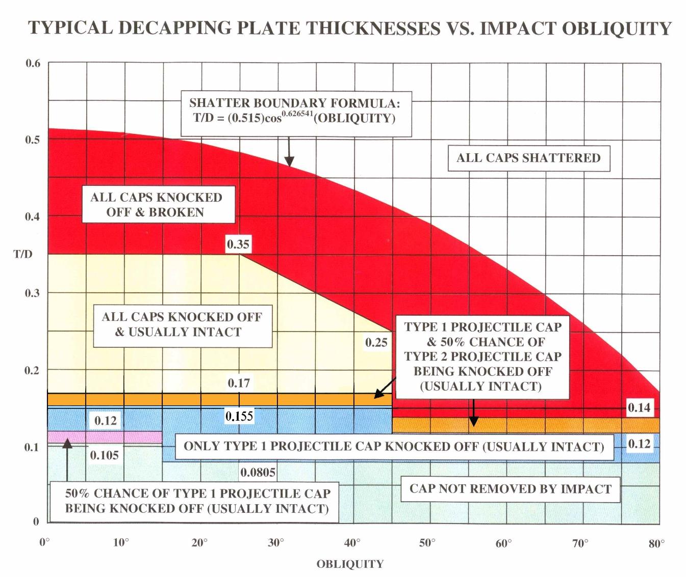 When using the Figure, take the thickness of the decapping plate and divide it by the nominal bore diameter of the gun (if a sub-caliber projectile, use its actual diameter) to get the thickness of the plate in calibers (T/D), then ROUND DOWN this value to the nearest 0.005-caliber. If the result is exactly on a boundary thickness in the Figure, use the results ABOVE the boundary. Also, if the obliquity value falls exactly on a vertical boundary, use the results to the RIGHT of the boundary (the higher obliquity results). Remember, the soft cap/hood vertical boundary shown for Type 1 hard-capped projectiles at 15° in the Figure is 50% of the time at 20° instead (flip a coin each time you have to use this particular region in a test to see which obliquity to use as the boundary). Use a similar coin flip in those three horizontal zones (one purple and two orange) to determine what happens if you fall inside them or on their lower edges, if they apply to your particular projectile (for the purple zone with a hood/soft cap, you will have to flip the coin twice if the obliquity is between 15° and 19.99° and the plate thickness is between 0.105 caliber and 0.1199 caliber).